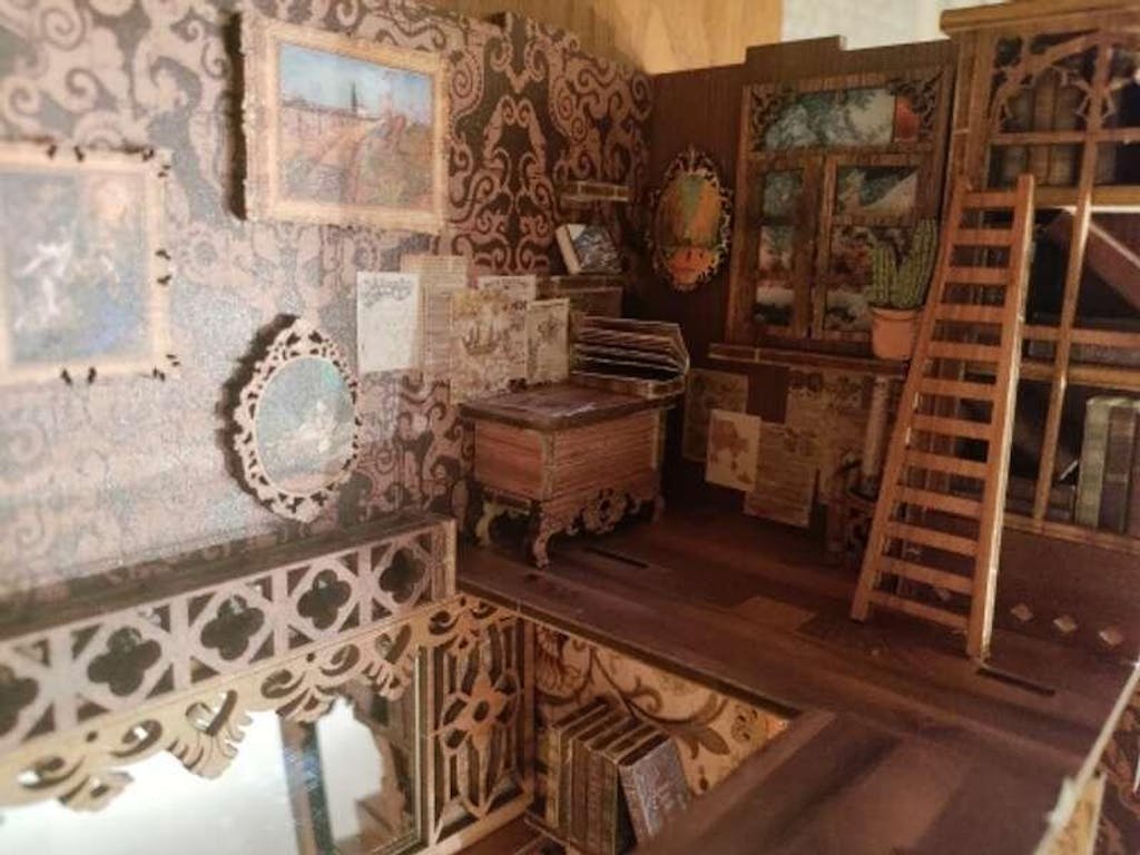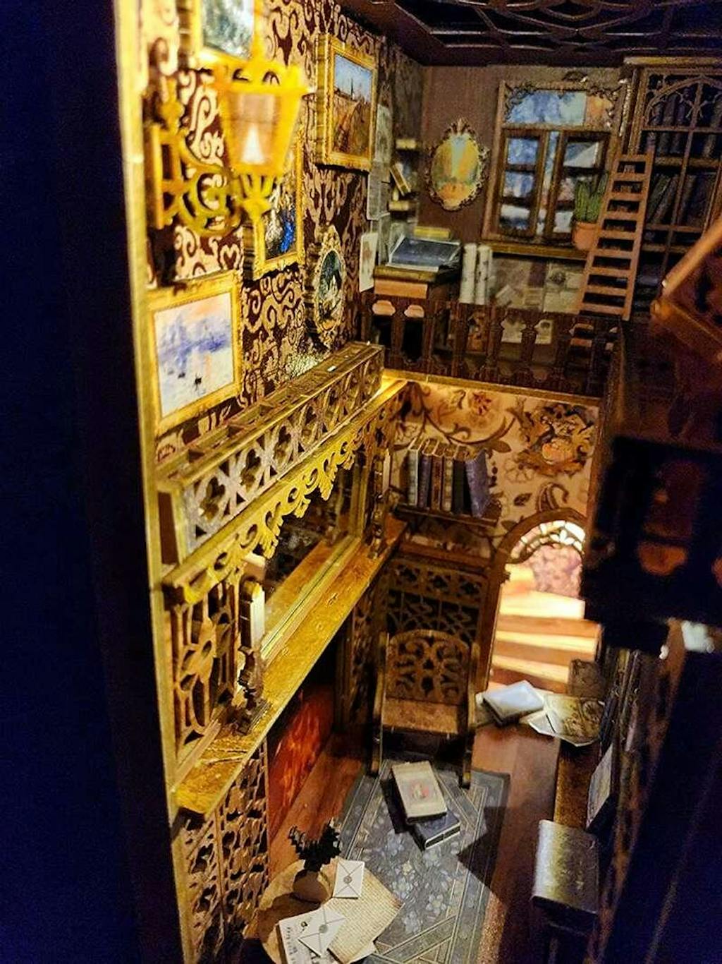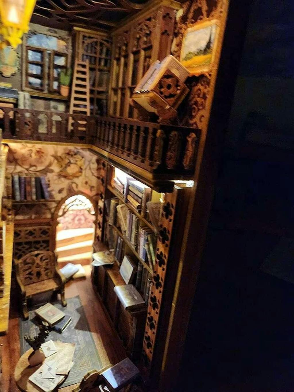 The classical design of this Book Nook features an upper and lower floor, with a corner staircase that creates an upward flow, enhancing the sense of space. The open design allows light to illuminate the intricate details inside. Imagine yourself by a cozy fireplace, surrounded by shelves of antique books and accompanied by a loyal dog. The scene is beautifully complemented by ornate wall lamps, framed oil paintings, and vintage candles, creating a warm and inviting atmosphere.