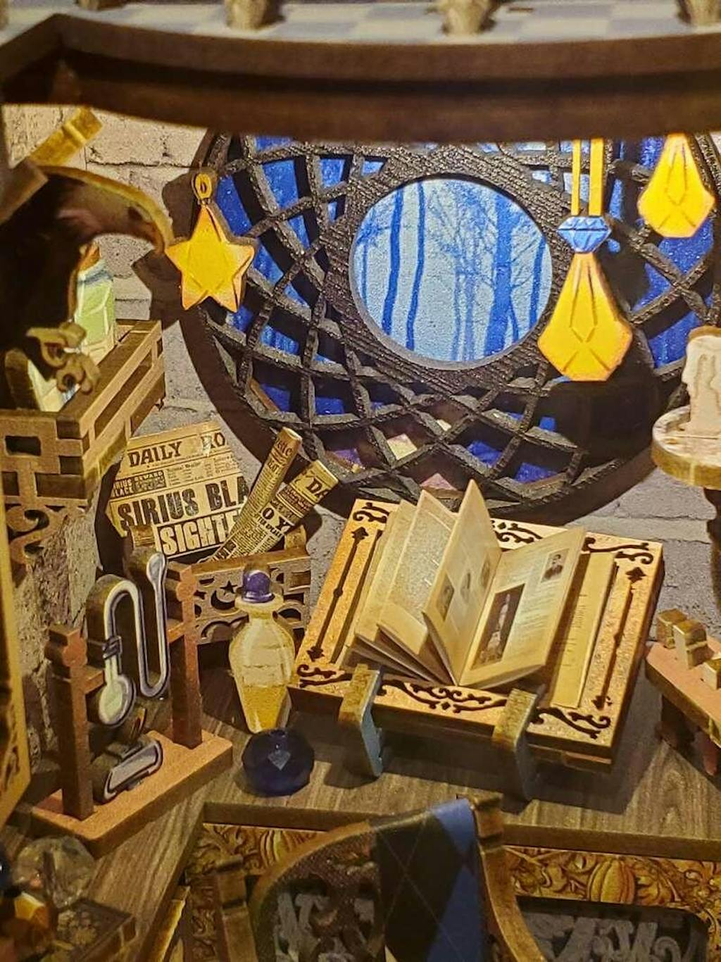 Bring the enchantment of the Nebula Common Room to your bookshelf, desk, or any flat surface with this delightful DIY Book Nook kit. Assemble, decorate, and light up your very own miniature world! Proudly display your creation as a unique bookshelf insert or a standalone miniature scene, perfect for any magic lover's home.