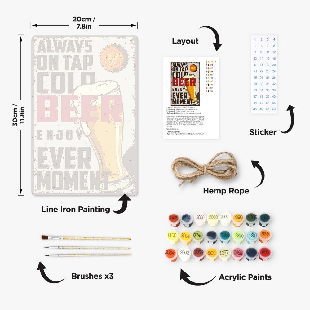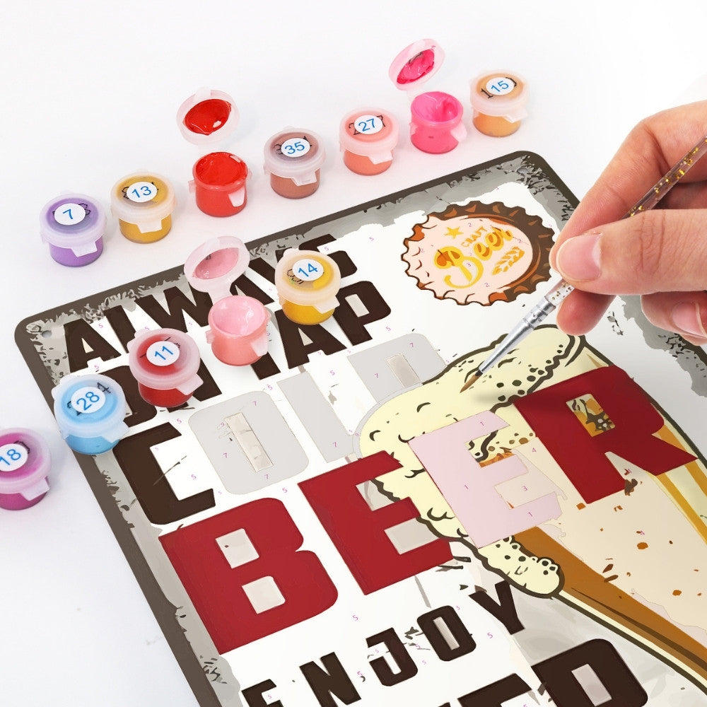 Bring a touch of vintage pub charm to your space with this beer-themed paint by numbers for adults from Figured'Art. Each painting by numbers metal poster features a crisp, retro design that evokes the cozy atmosphere of a classic pub. It's perfect for beer lovers and hobbycraft enthusiasts alike. This diy kit provides a fun and relaxing way to create your own pub-style wall art. Once your artwork is complete, you can easily hang your poster using the included hemp rope or choose to mount it with screws (not included). Ideal for decorating bars, pubs, garages, kitchens, or any corner where beer lovers gather. Enjoy a creative hobby while adding a touch of personality to your space. 🍺