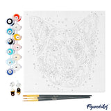 2) You will receive a ready-to-use kit containing the canvas with the numbered areas, the numbered pots of paints, paint brushes and a picture of the expected result to guide you. Let the journey begin!