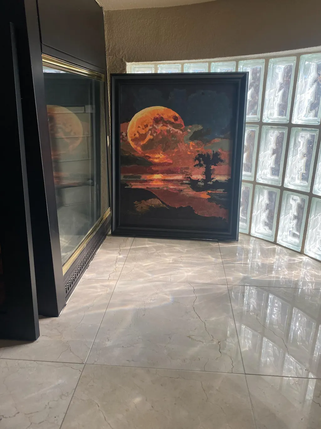 I enjoyed painting this scene. I had the canvas mounted in a simple back frame. Then I temporarily placed it to one side of fireplace so that the painting was illuminated by natural sun light from the back of the canvas. I am pleased with the project.